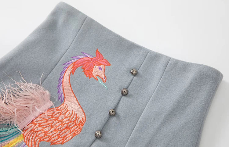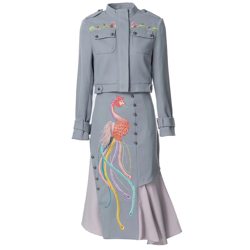 طقم مكون من قطعتين من سترة آريا ذات ياقة قائمة وأكمام طويلة وتنورة من الريش على الطراز الصيني