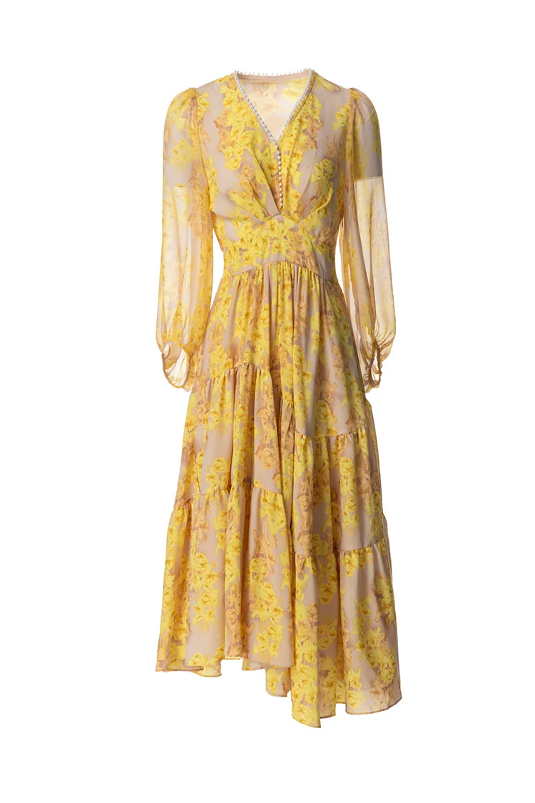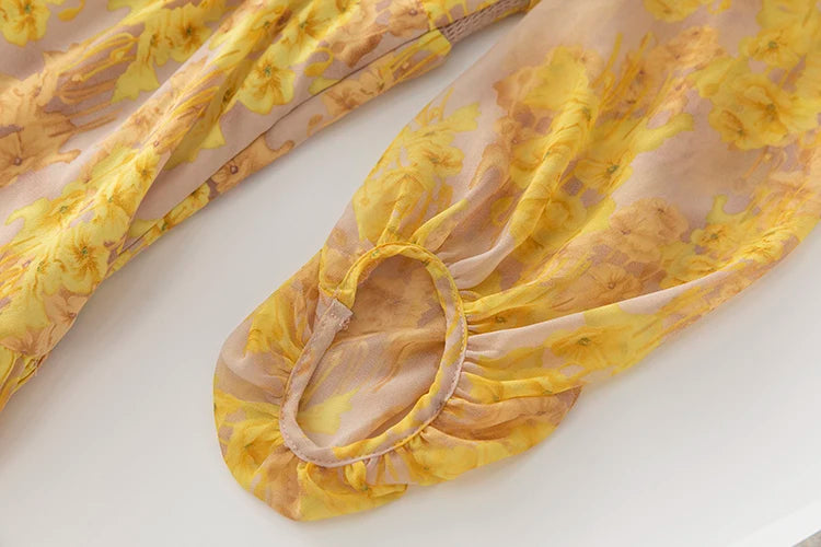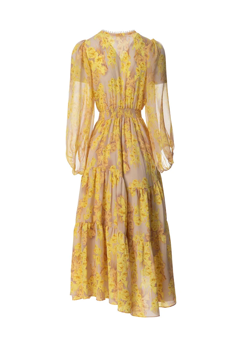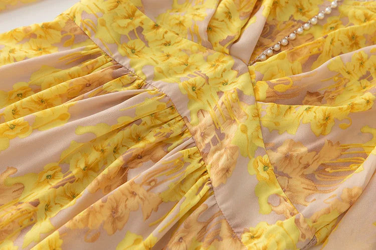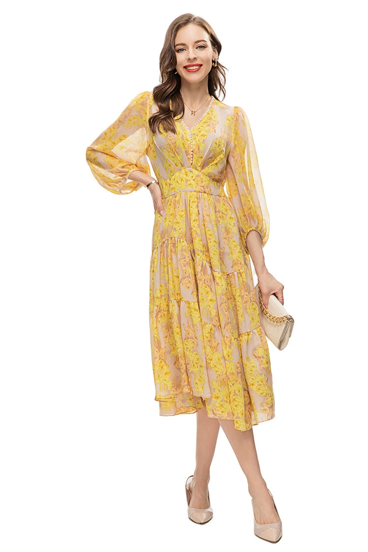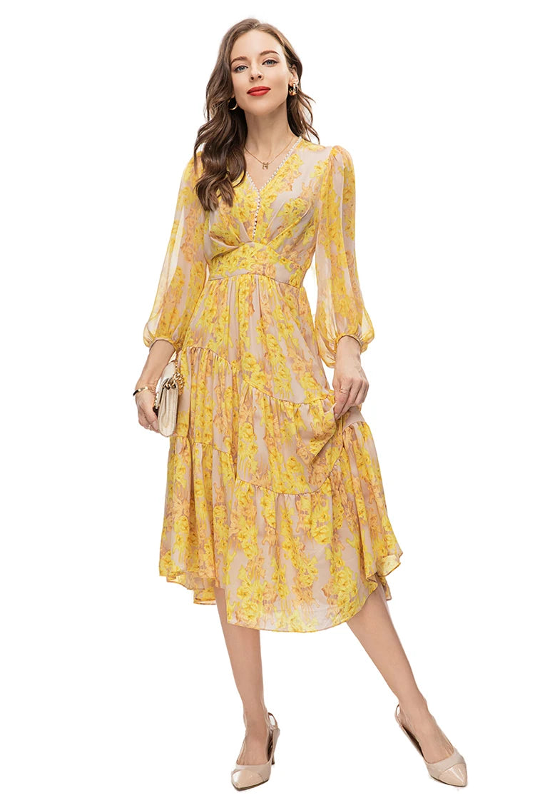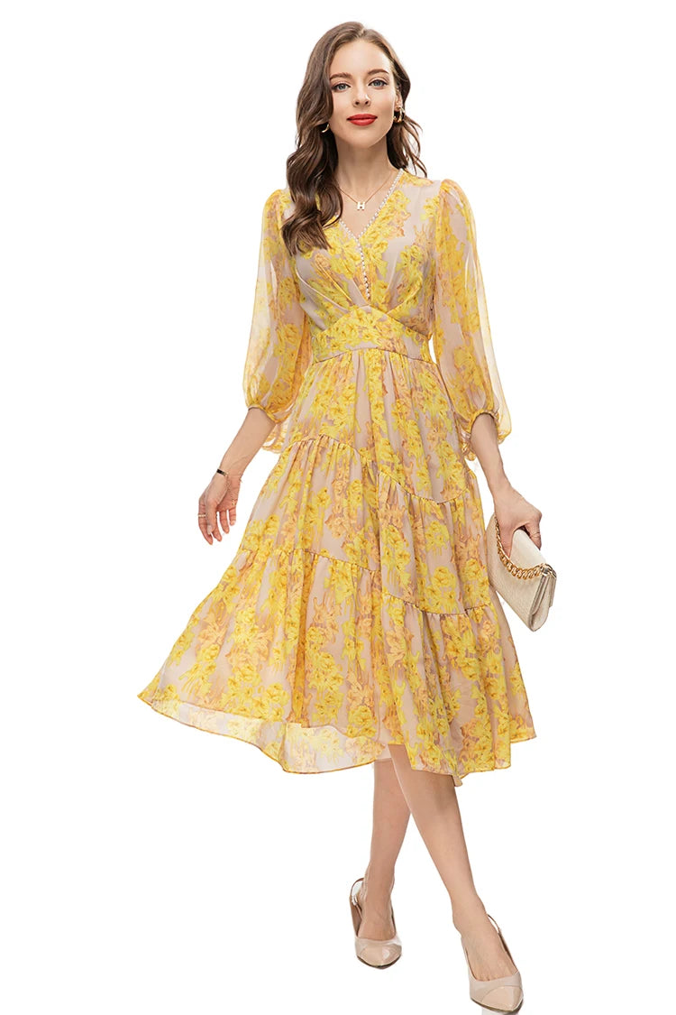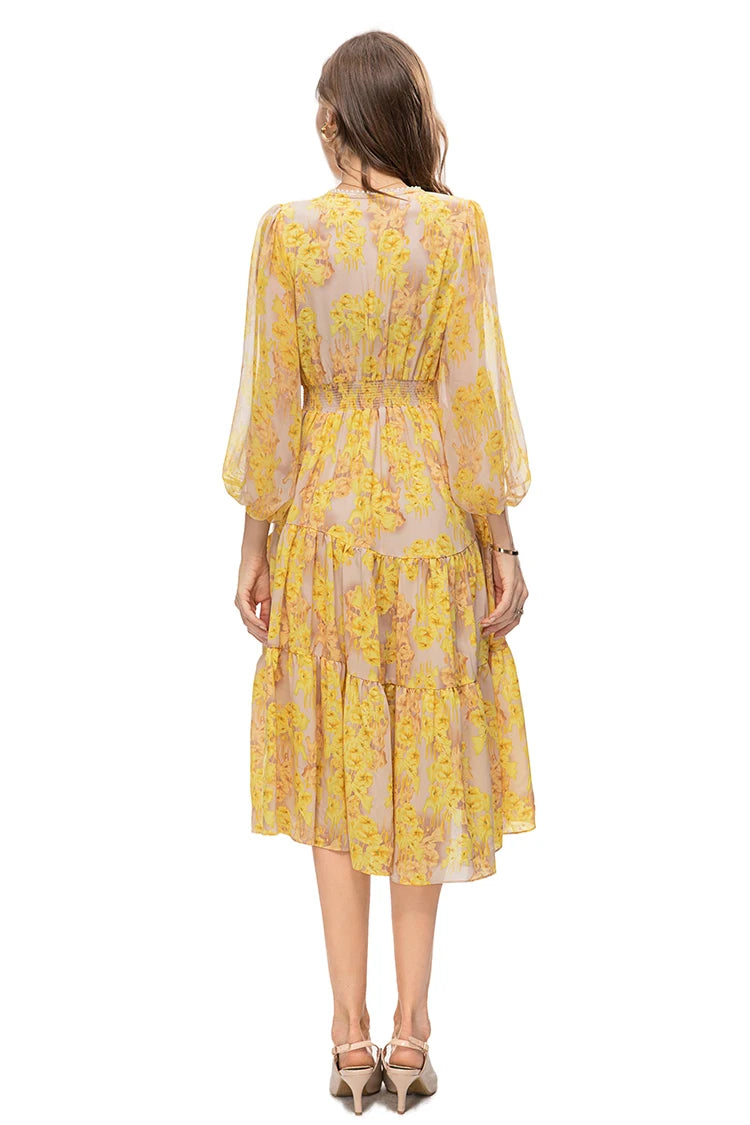 فستان ليلى فينتيج ميدي بطبعة زهور للنساء بفتحة رقبة على شكل حرف V وخصر مرن وحواف غير منتظمة وكشكشة