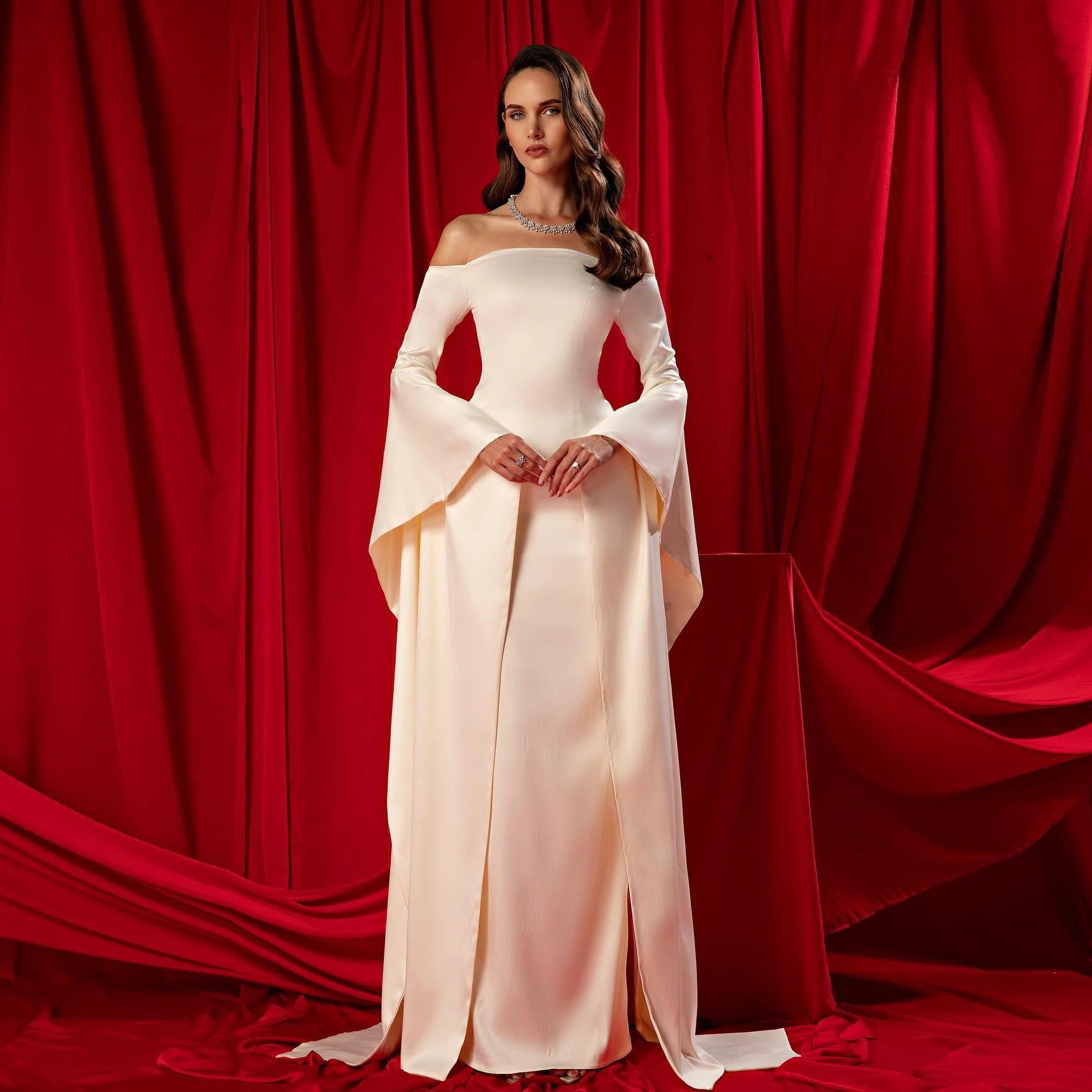 Angel Off Shoulder Arabic Evening Dress Beige Ivory Beige Flare Sleeve