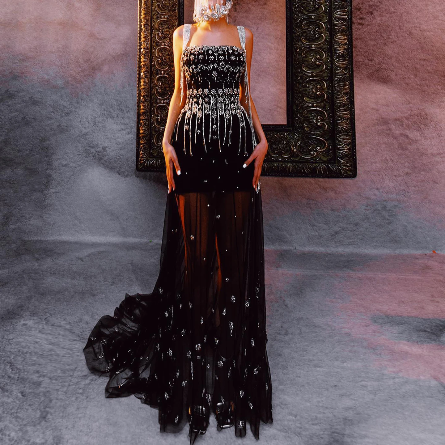 Luxury Crystal Tassle Black Evening Dress with Straps / Cape Strapless Gown