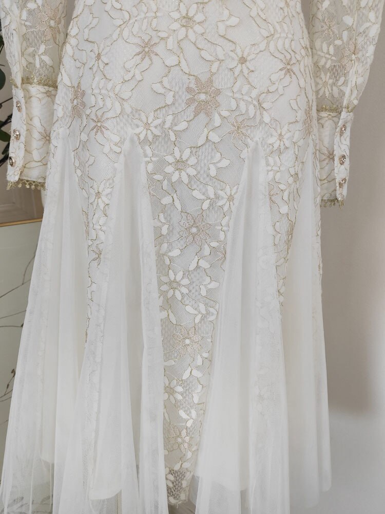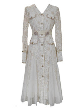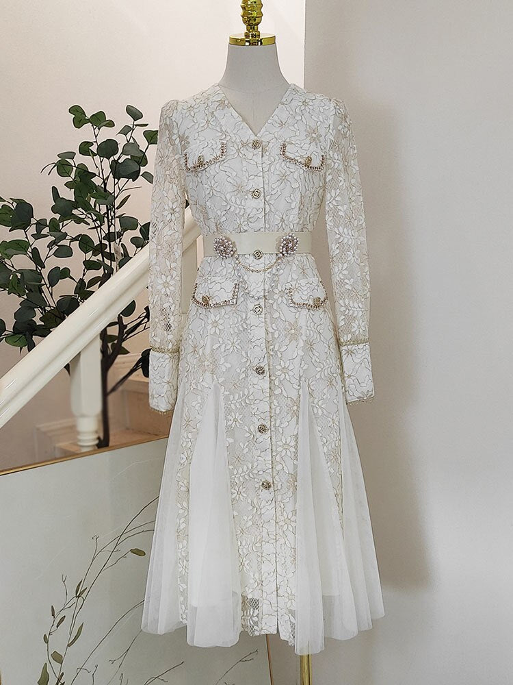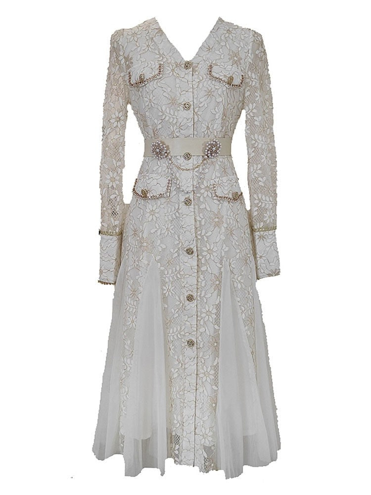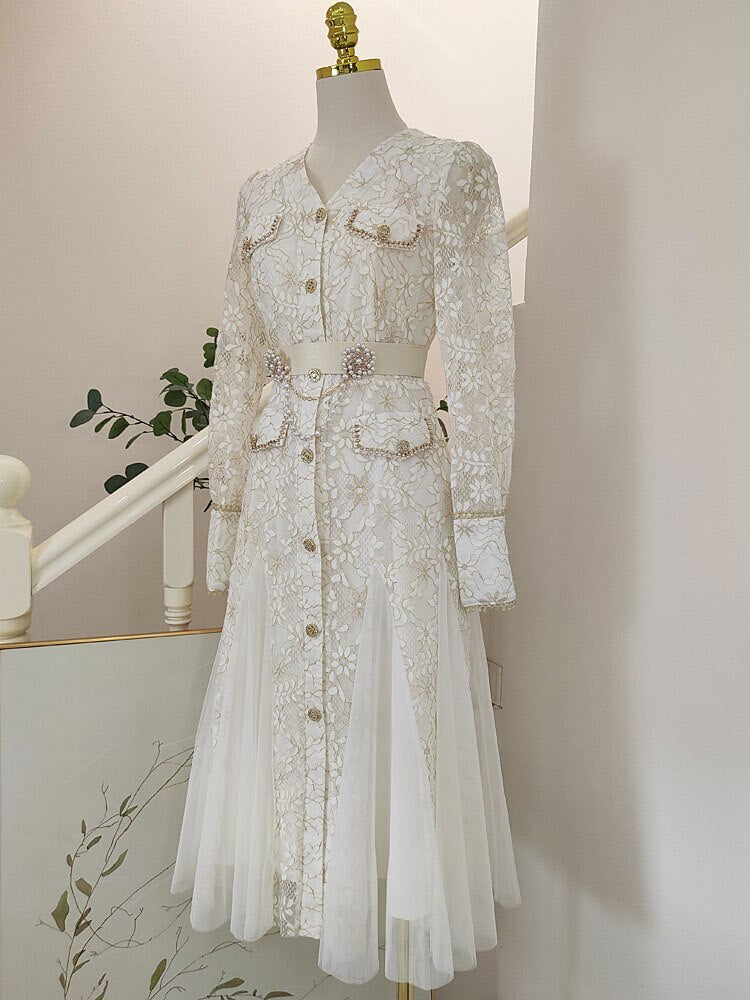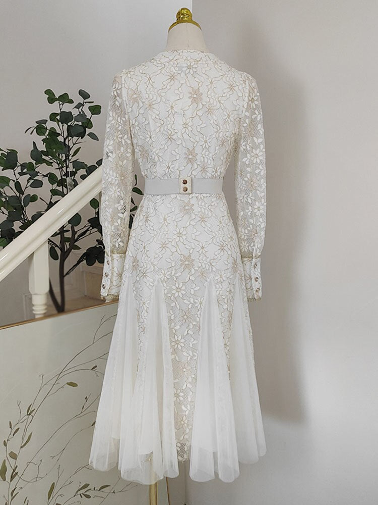 Annette V-Neck Lace Splicing Mesh Fishtail Flounce Inlaid With Faux Diamonds