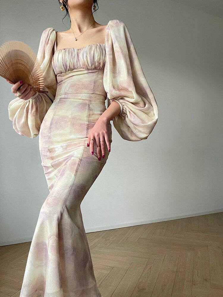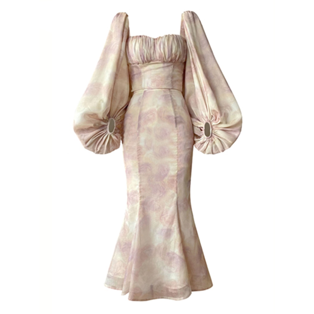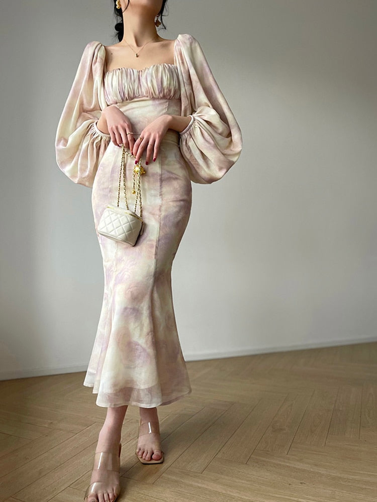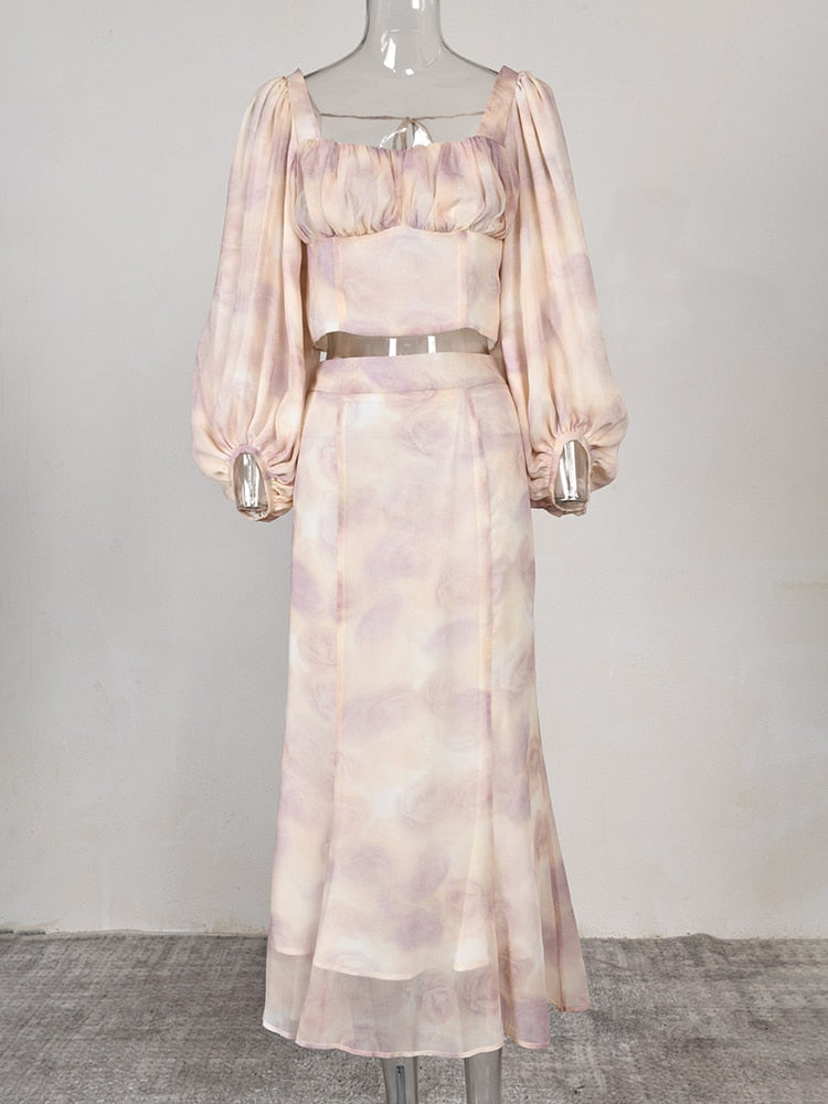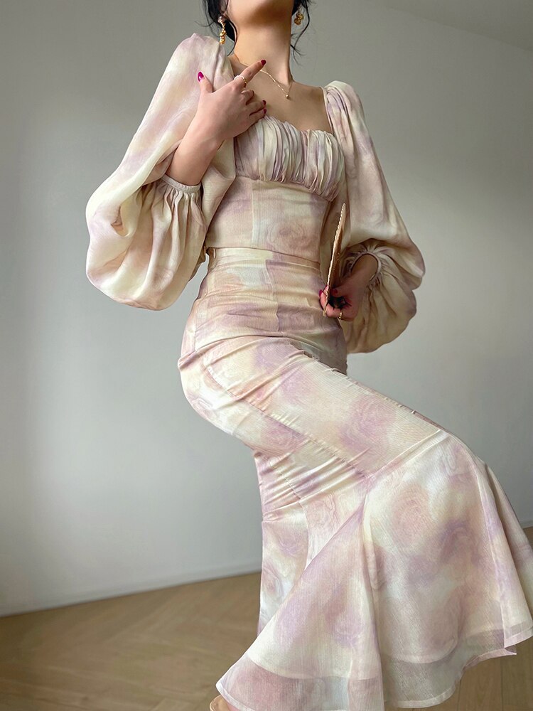 Delilah 2 Pieces Set Square Collar Lantern Sleeve Top Hip Wrap Fishtail Skirt