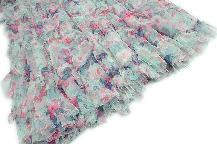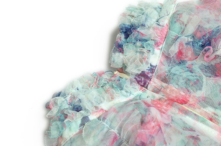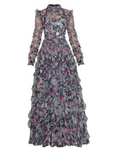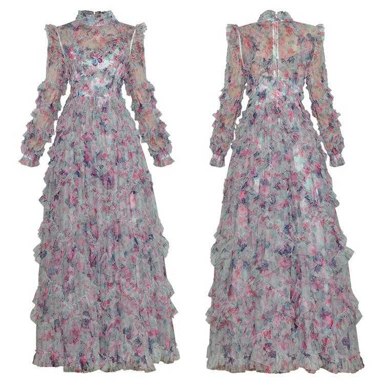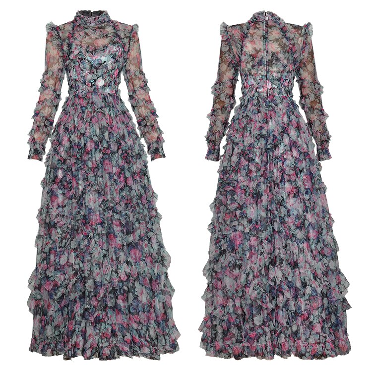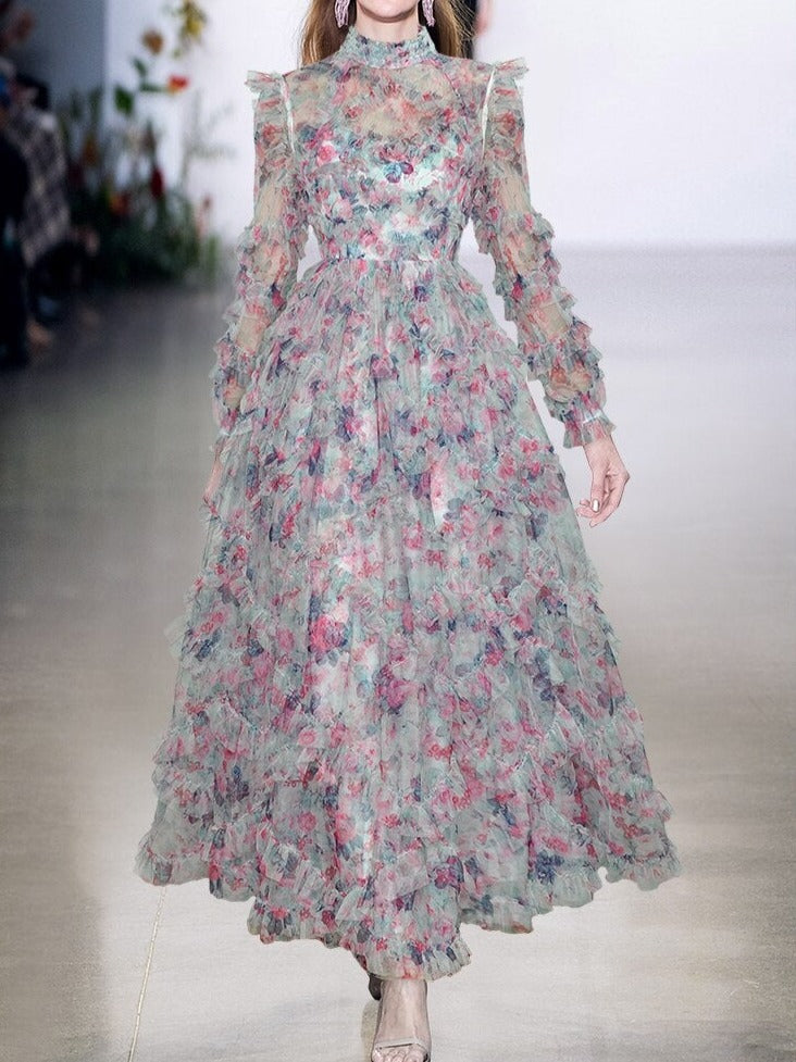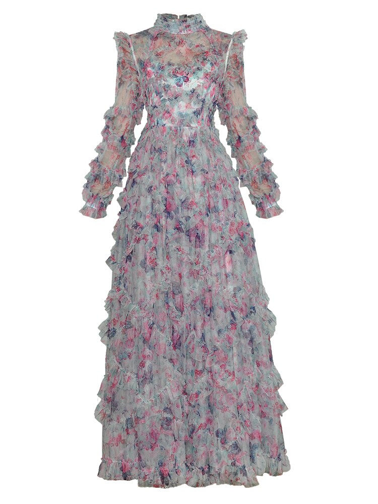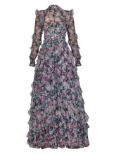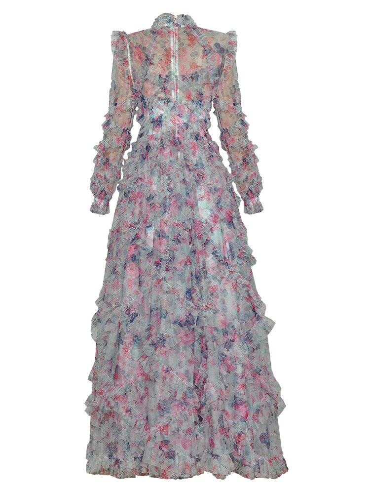 Eleonore Stand collar Long Sleeve Printing Ruffles Grace Casual Grey Midi Dress