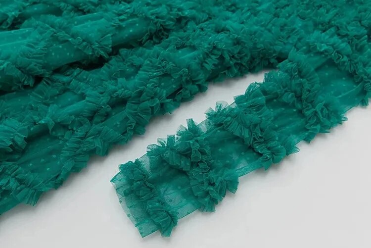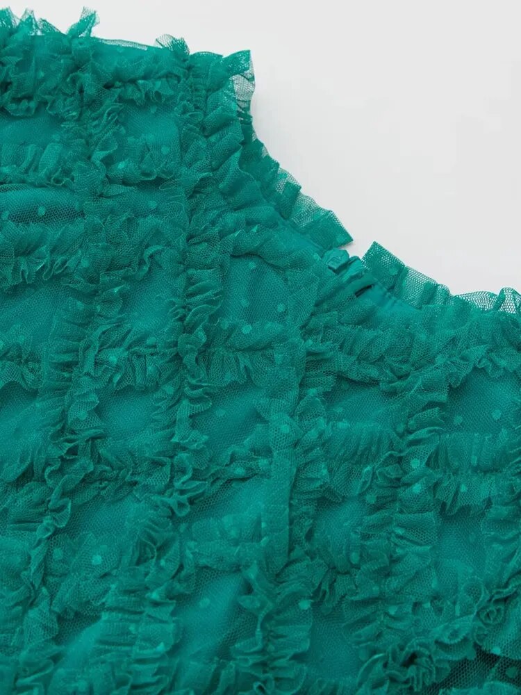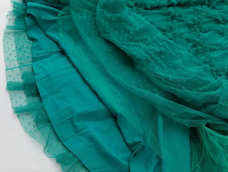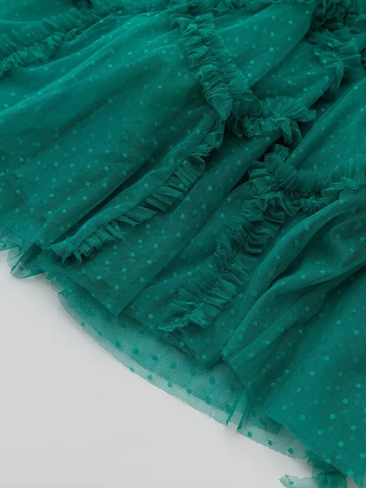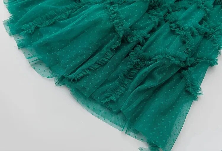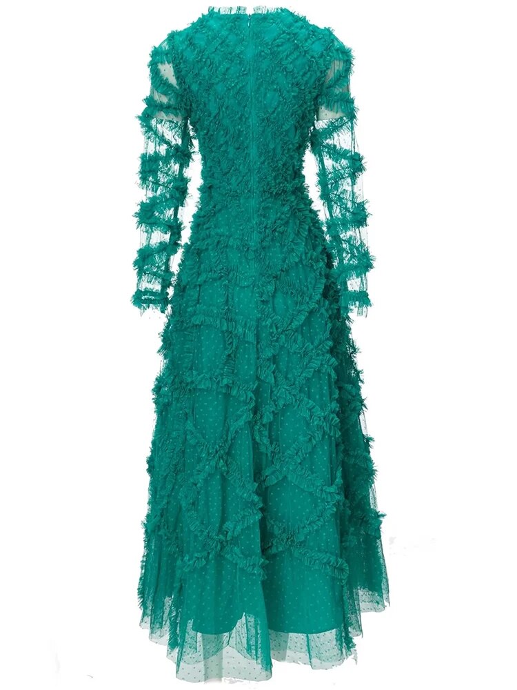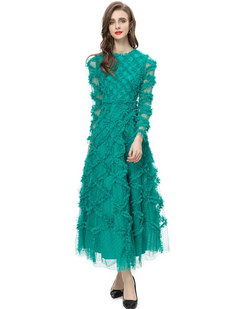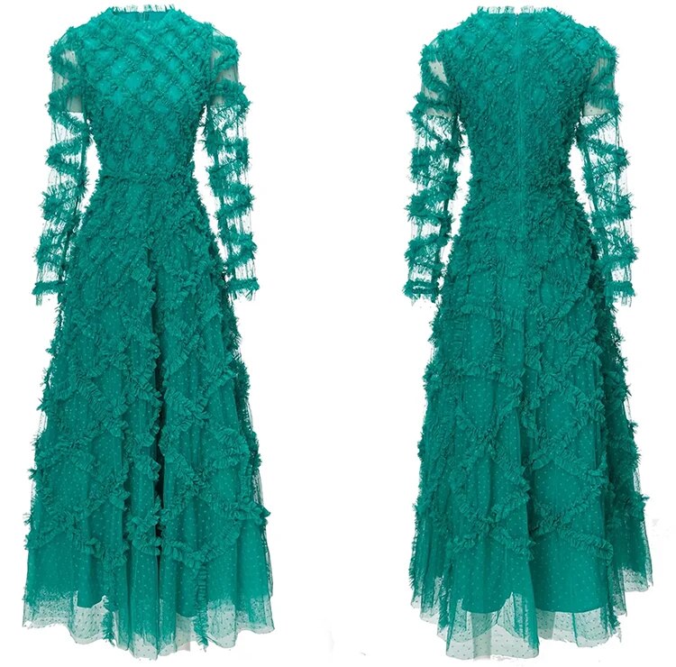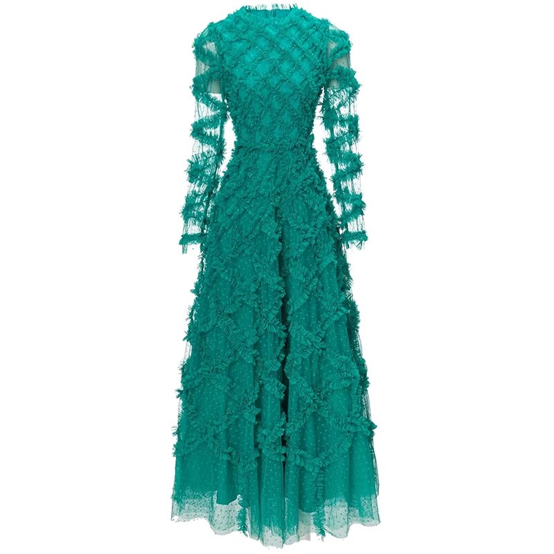 Elyse Dot Mesh O-Neck Long Sleeve Tiered Ruffles Elegant Party Long Dress