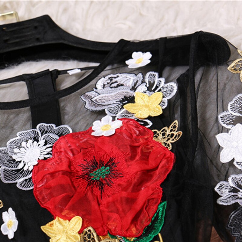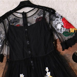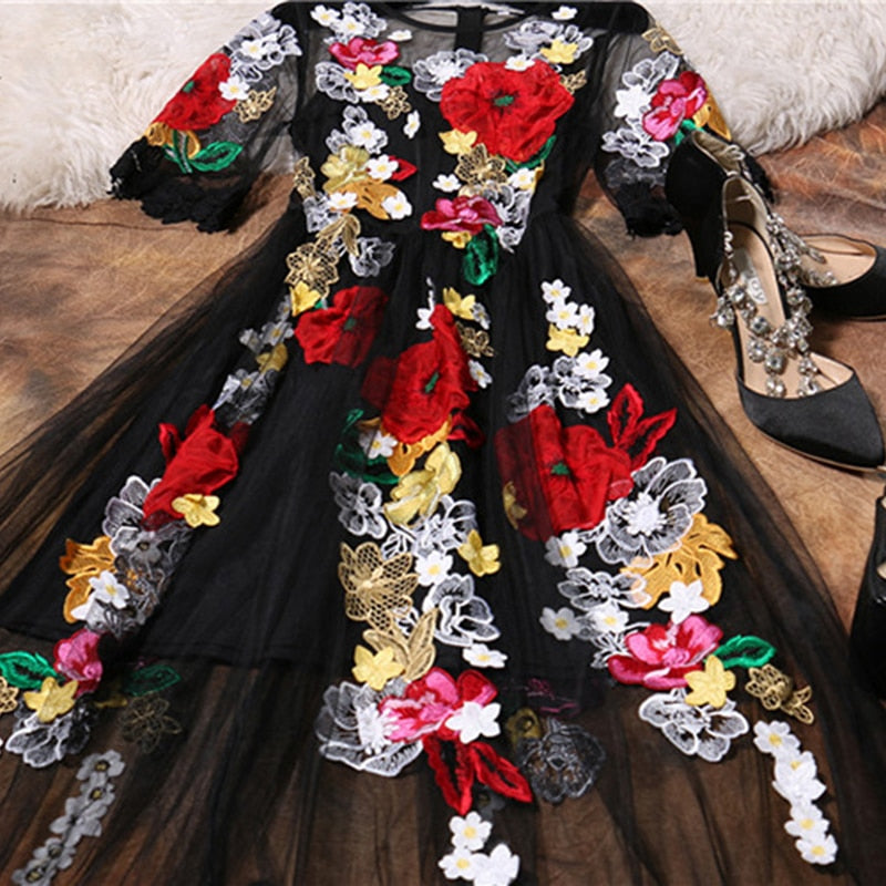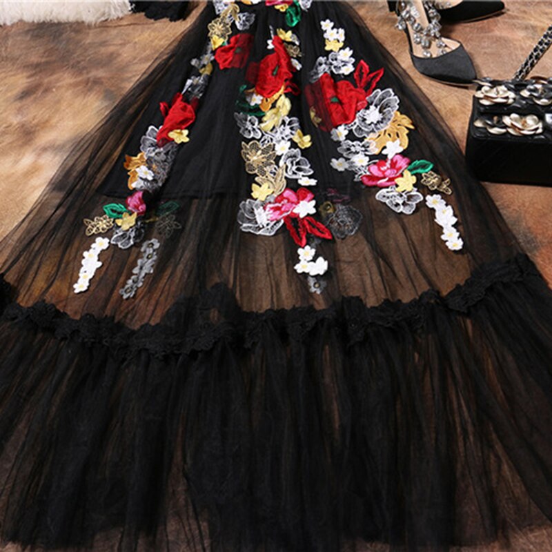 Luxury Flower Embroidery Appliques Black Mesh Maxi