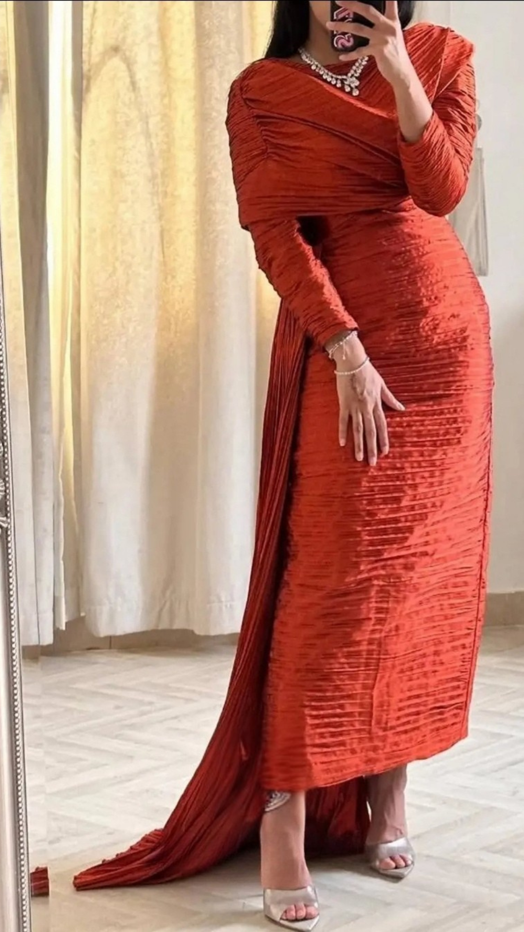 Orange Mermaid Evening Dress with Ruched Long Sleeve Overskirt