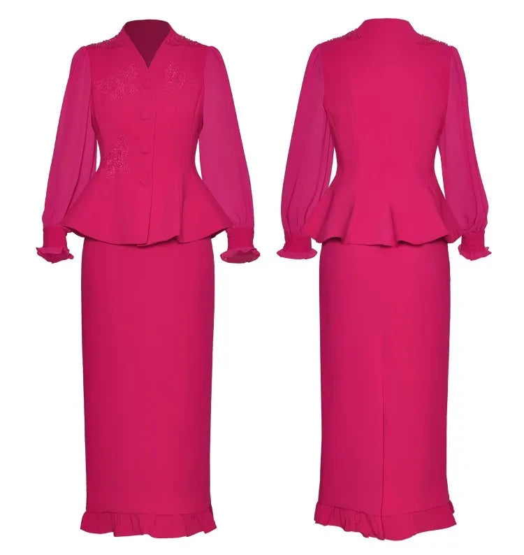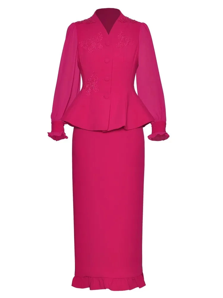 Philippa Single Breasted Embroidered Top + Pencil Skirt 2 piece Set