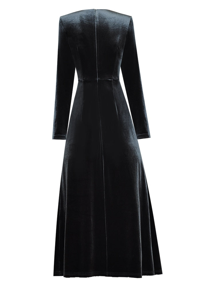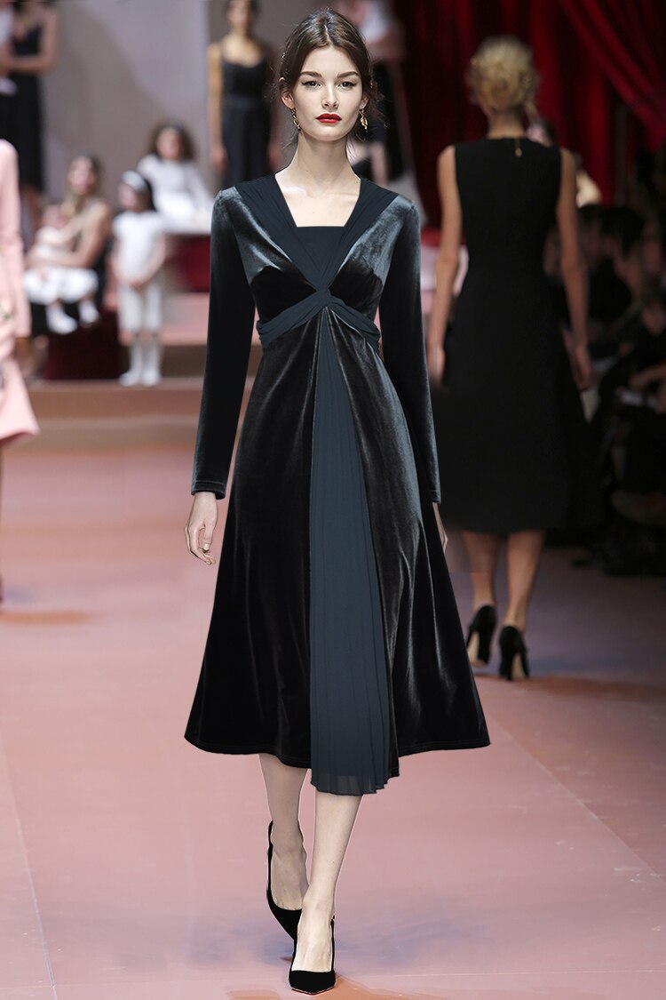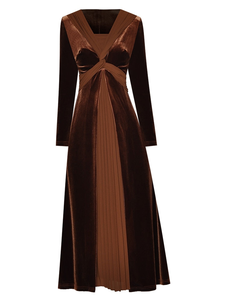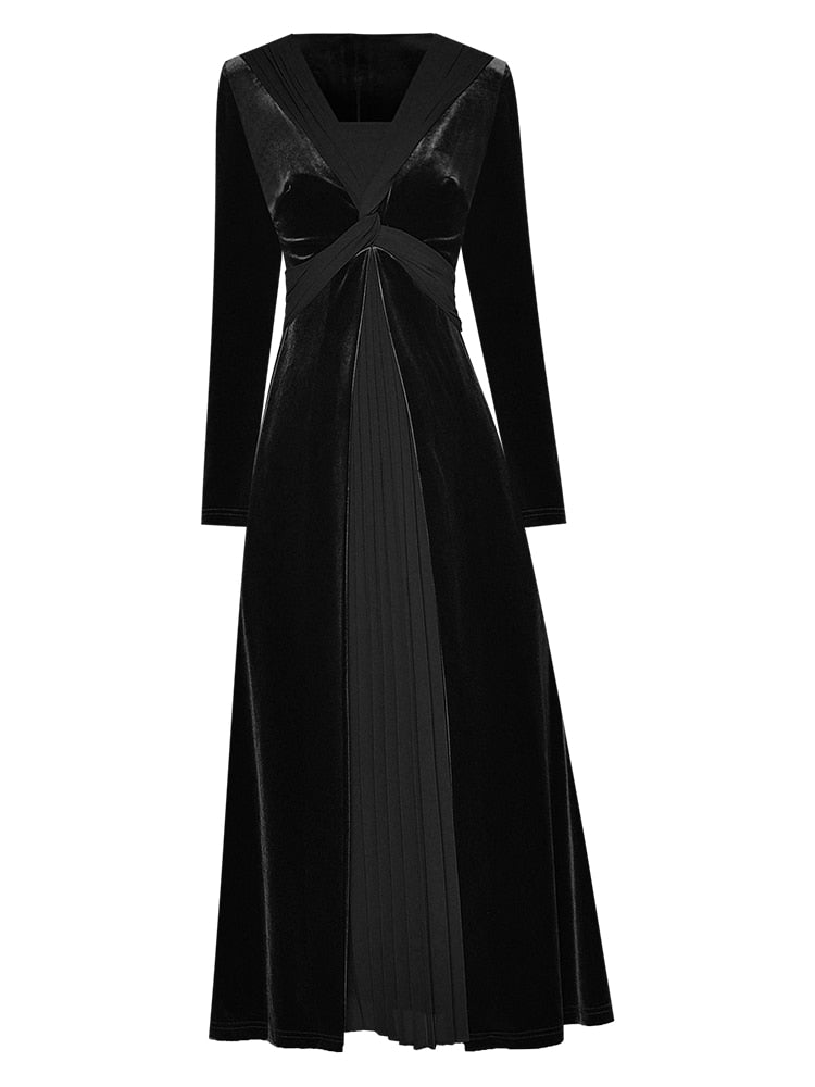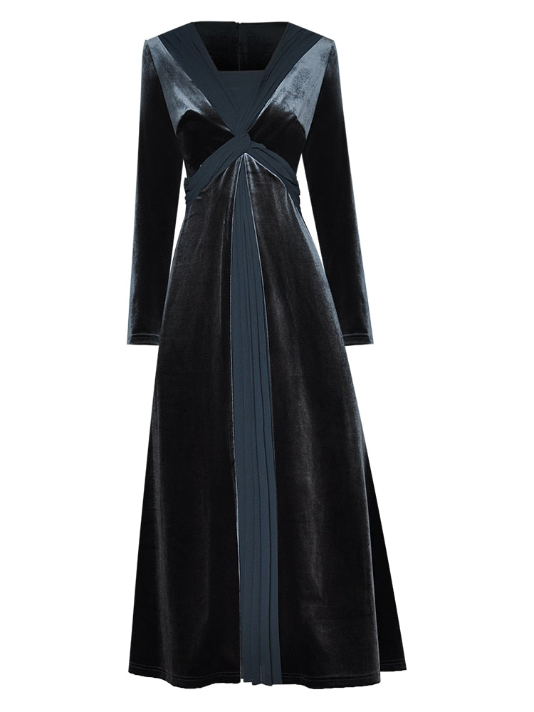 Renata Velvet Midi Dress Women's Square Collar Long Sleeve Patchwork Pleated Party Dress