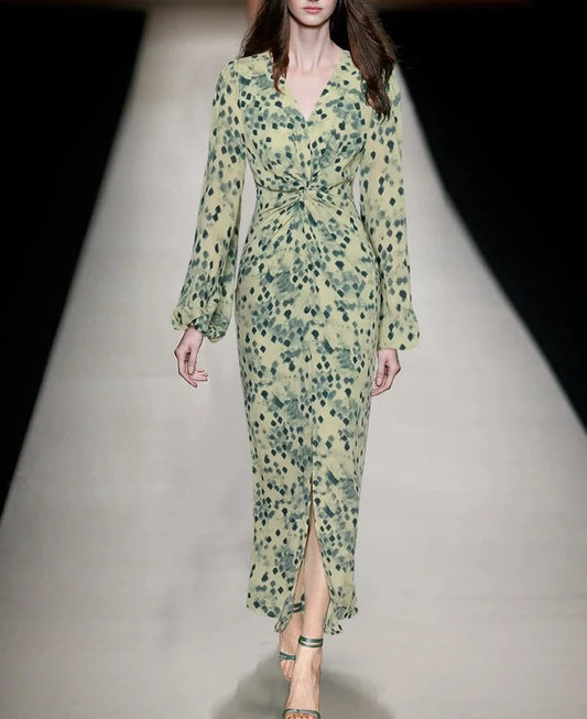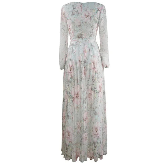 Zhuri Vintage Print Lantern Sleeve Pleated High Waist Long Dress