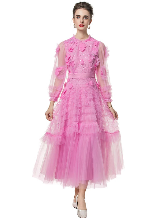 Tehila Mesh Maxi Dress Women O-Neck Lantern Sleeve Sequins Ruffle Vintage Party Ball Gown Dress